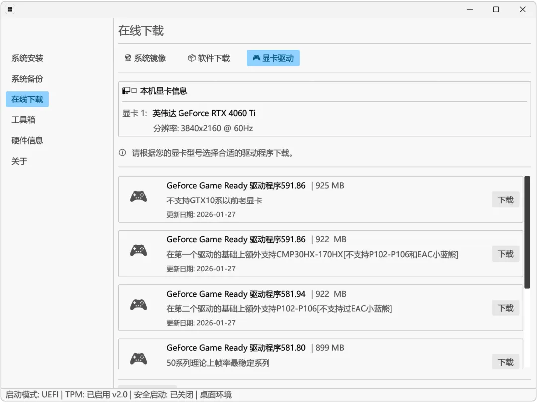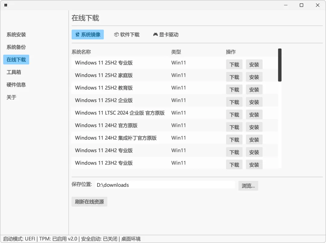 与此同时,也支持在线下载安装,提供了Win11、Win10各个不同版本:
