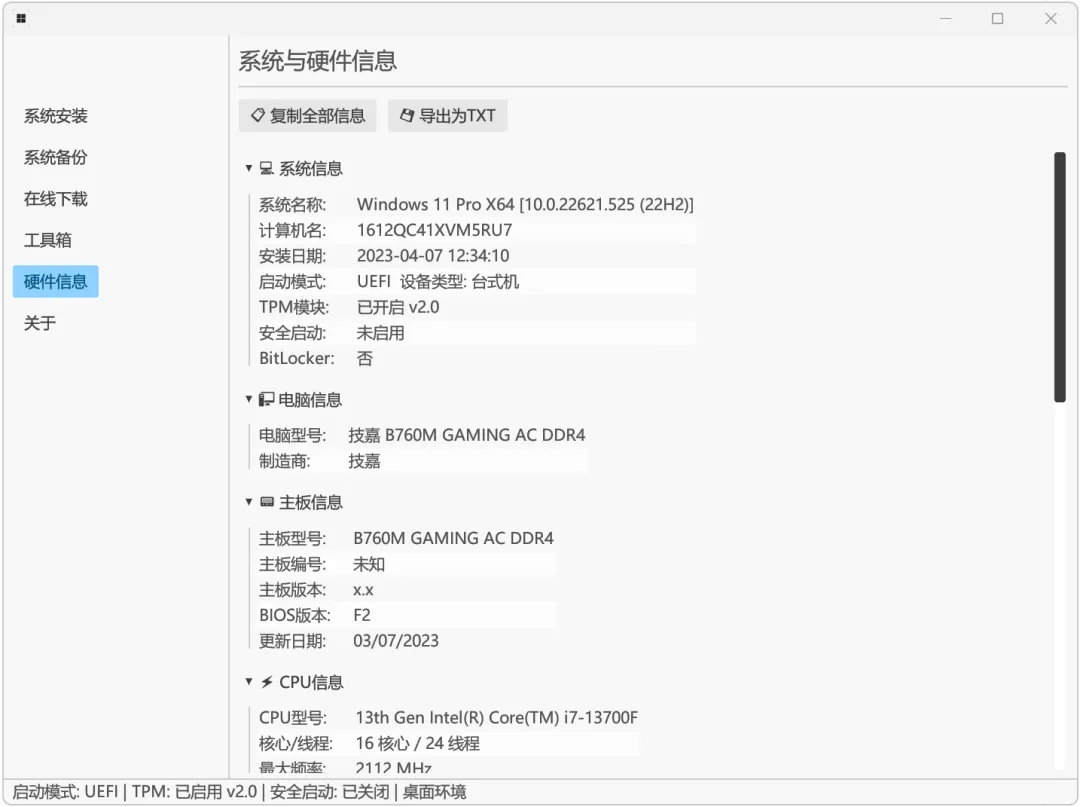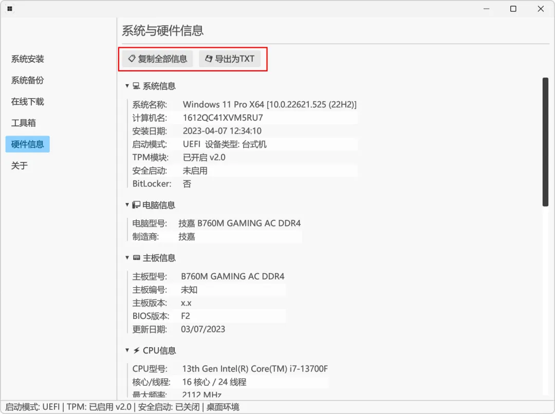 至于硬件信息,则能查看当前系统与硬件的相关内容,并能将其导出为TXT文本: