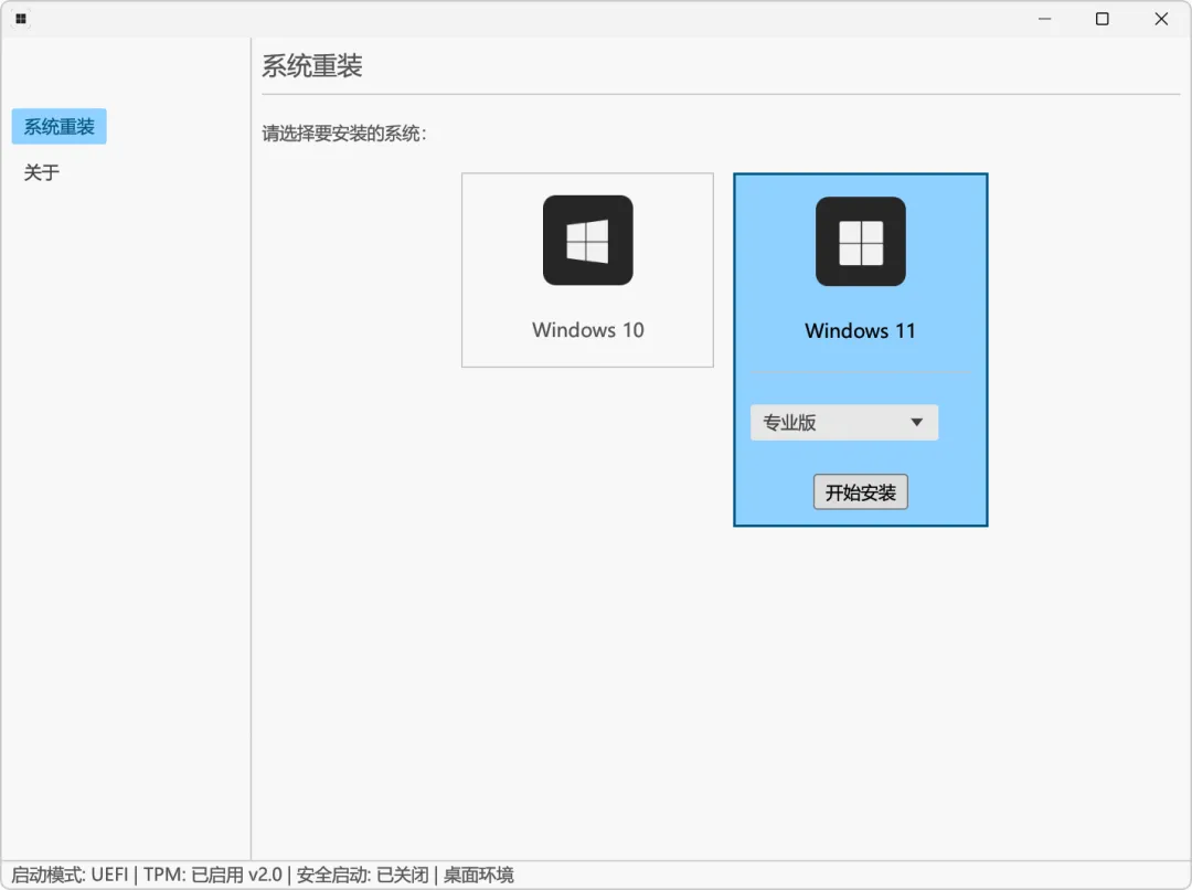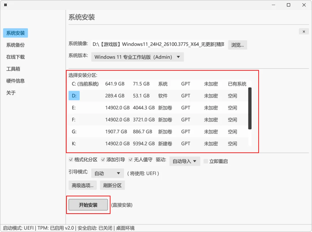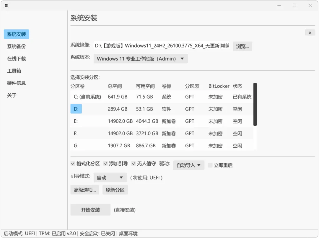 用法也很简单,进入左侧系统安装,指定具体镜像,以及版本,一般推荐专业工作站版,拥有管理员权限的!