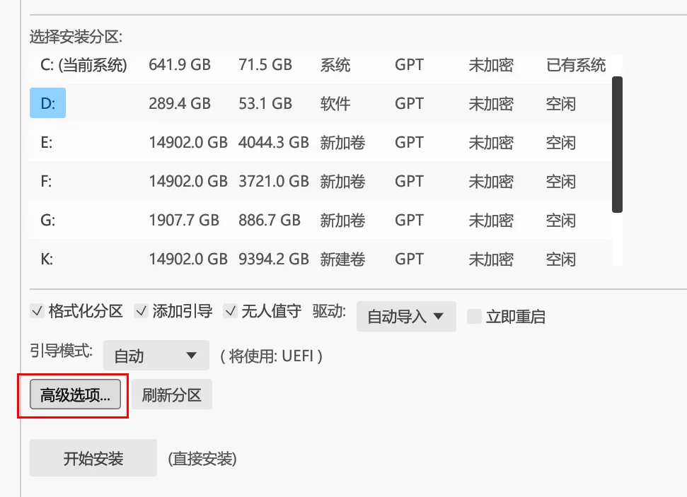 选择想要安装的分区,支持多系统!比如安装到D盘,点击底部开始安装即可: