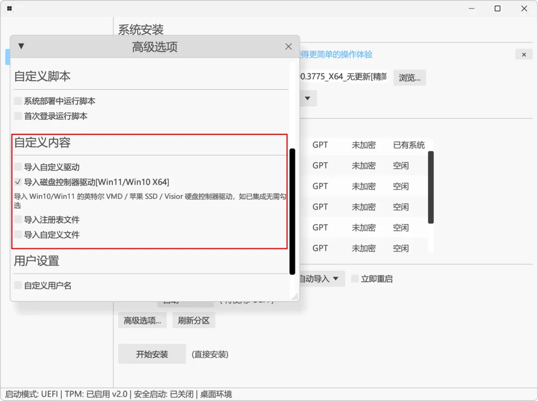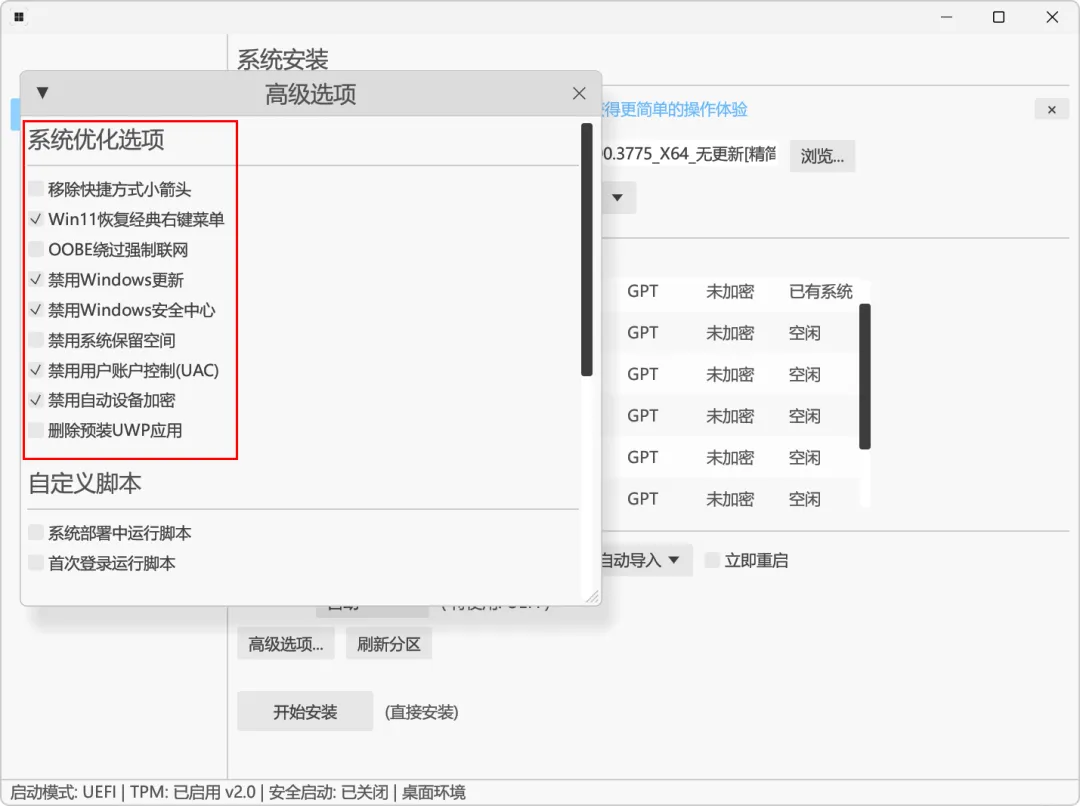 高级选项里,也可以提前设定系统优化功能: