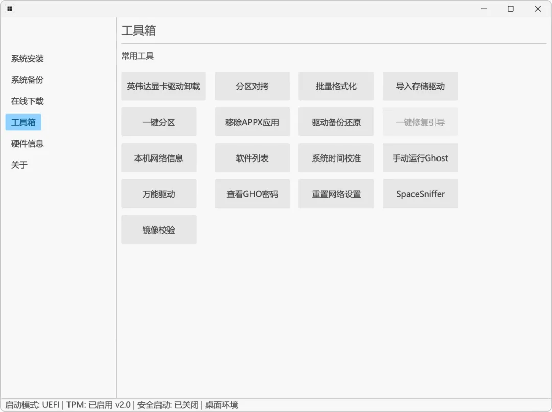 工具箱里,则涵盖了各种实用功能,比如:显卡驱动卸载、批量格式化、导入驱动、一键分区、驱动备份还原、网络设置还原等: