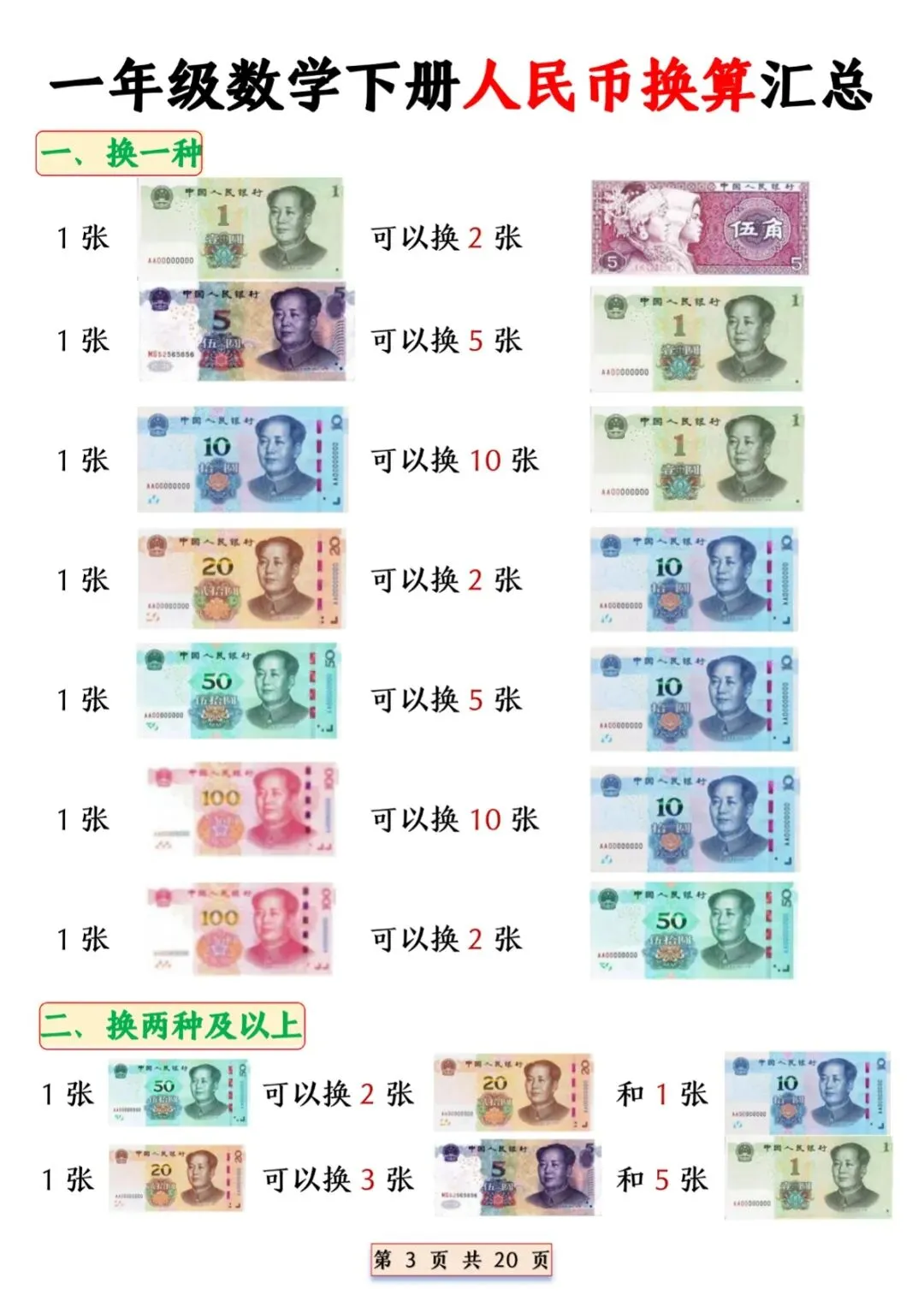 一年级(下)数学 人民币换算专项