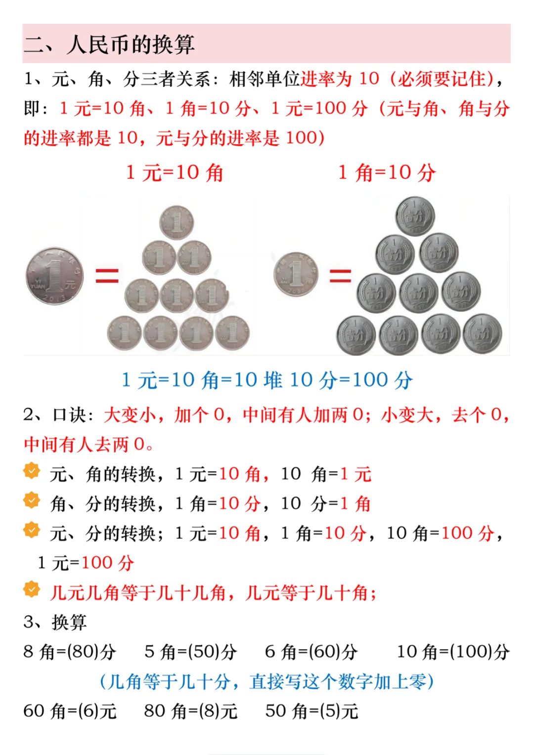 一年级(下)数学 人民币必考知识汇总