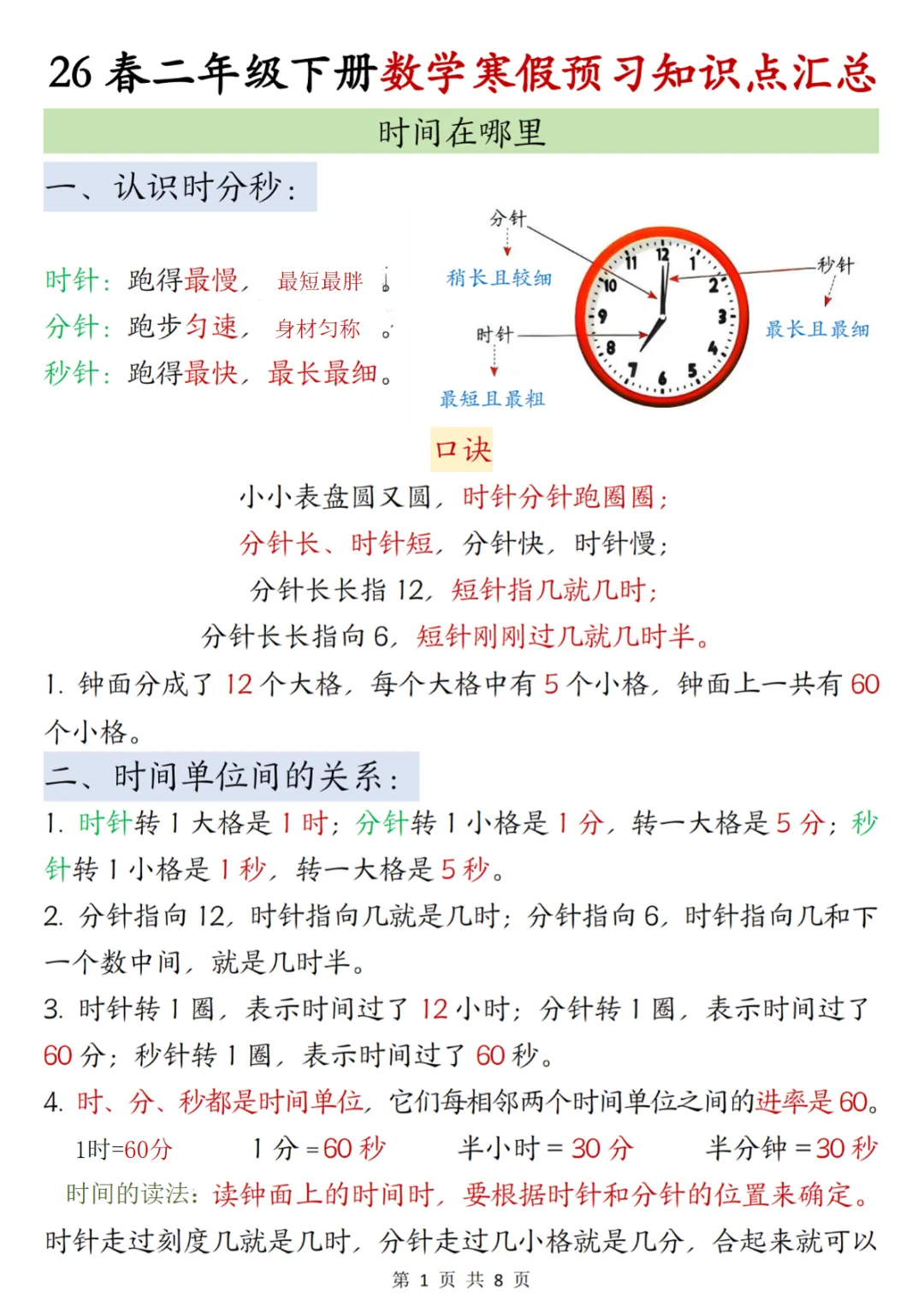 【免费下载】二年级(下)数学 寒假知识汇总,PDF电子版,共8页,可打印