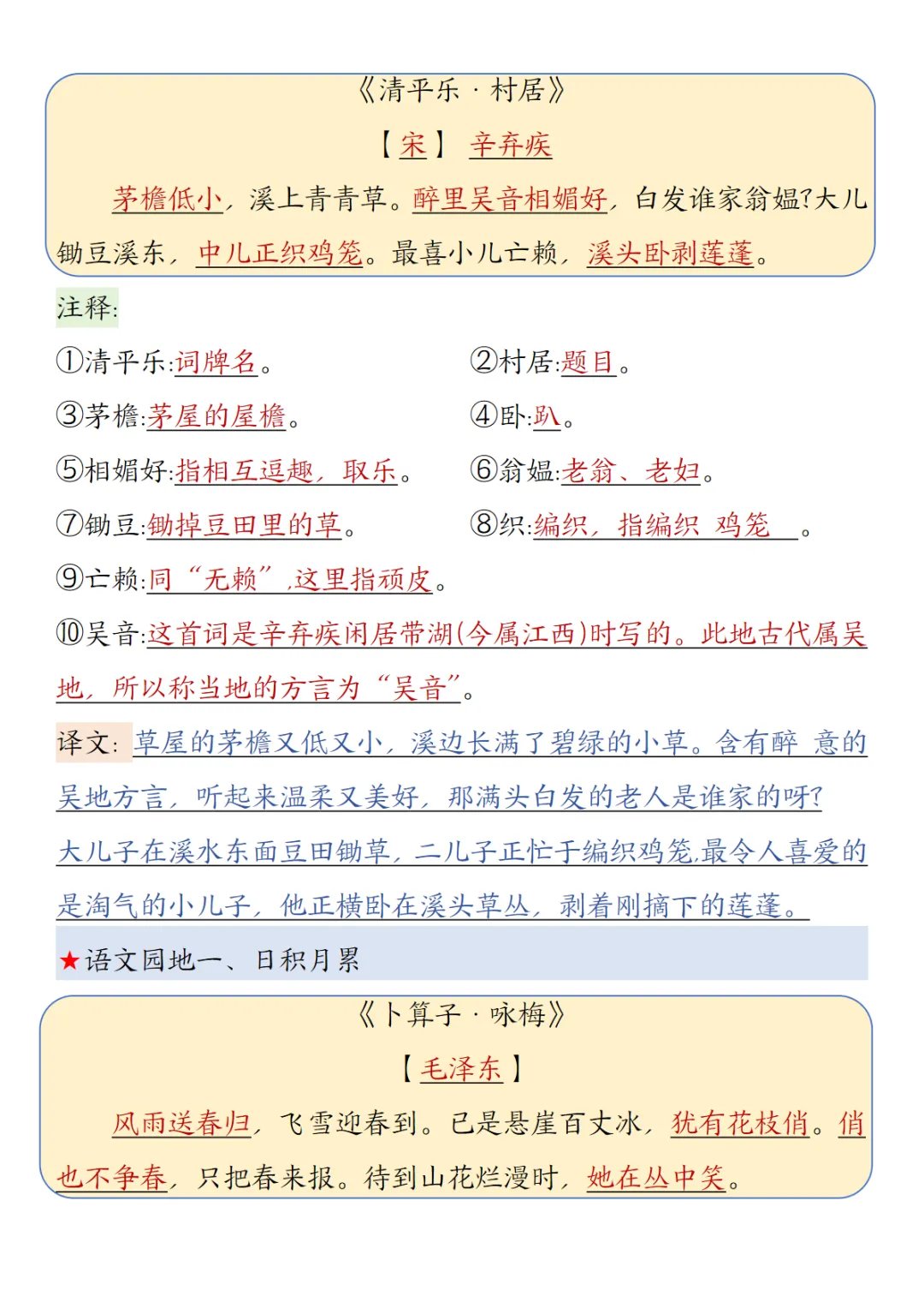 【免费下载】四年级(下)语文 寒假必背内容汇总,PDF电子版,共6页,可打印