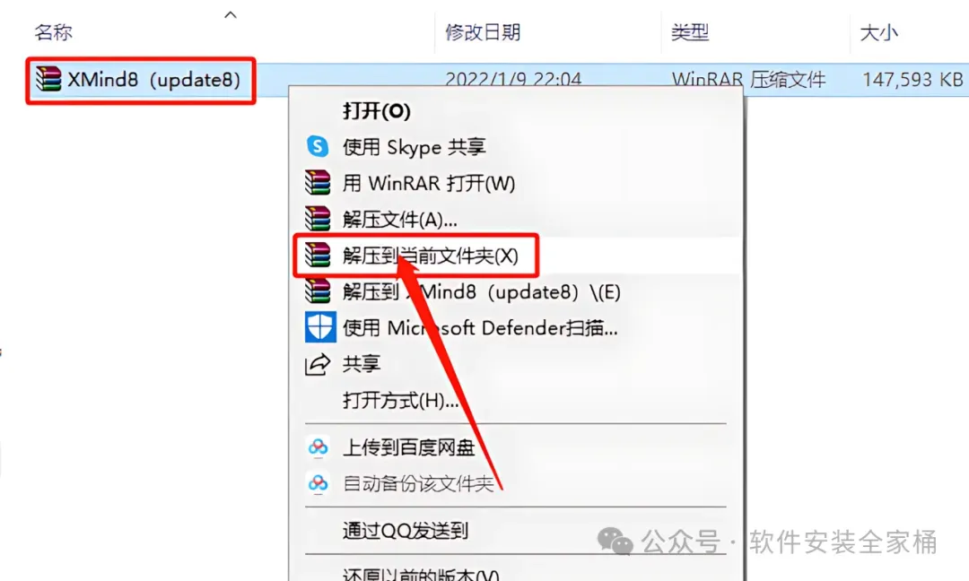 1.打开下载的Xmind 8软件安装包,鼠标右击压缩包选择【解压到当前文件夹】。