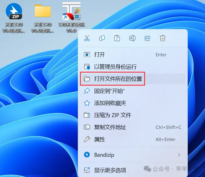 11、回到桌面,右键桌面上的【T20天正建筑V6.0软件图标】,点击【打开文件所在的位置】