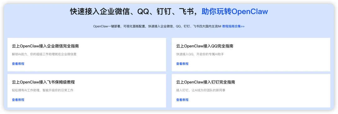 阿里云还给了详细的教程,跟着步骤点几下,就能把OpenClaw对接上微信、QQ、钉钉或飞书。