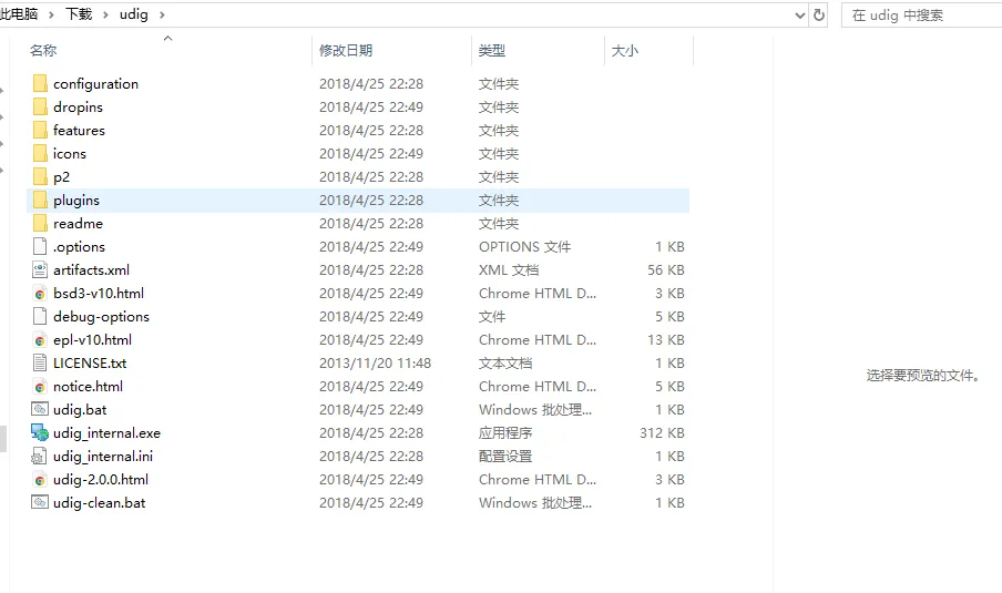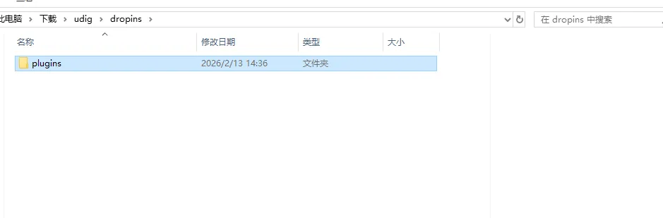 - 6. 将下载的UDIG2.0汉化插件解压,复制其中的 “plugins” 目录,粘贴至 udig安装目录下/dropins 目录,如下图所示: