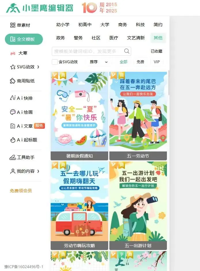 小墨鹰编辑器的行业专题功能解决了各垂直领域的特殊需求,其边框标题样式不仅美观,更能精准传递行业特性。例如政务用户可选择党徽、红旗等元素的边框,教育用户可按数学、语文等学科快速筛选合适样式。