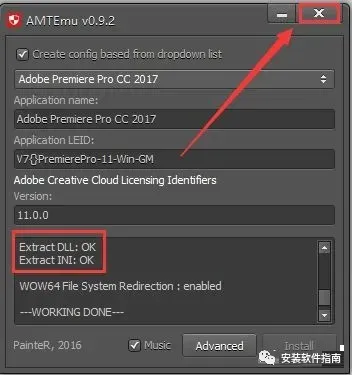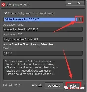 7.在注册机页面选择Premiere Pro CC2017,,然后点击右下角的Install