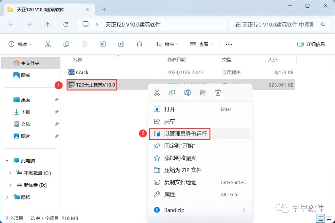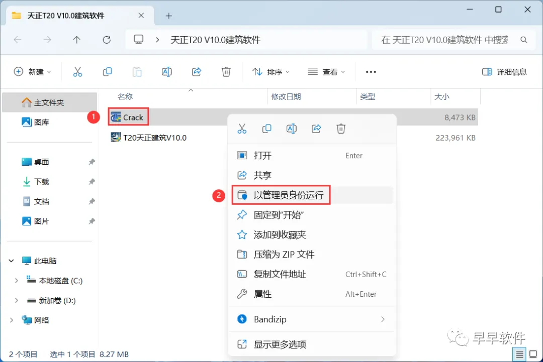 9、回到天正T20 V10.0建筑软件文件夹,找到【Crack】应用程序,右键选择【以管理员身份运行】它