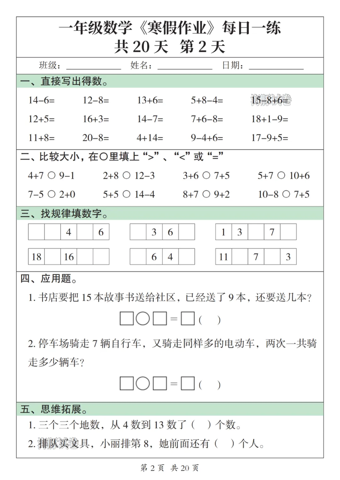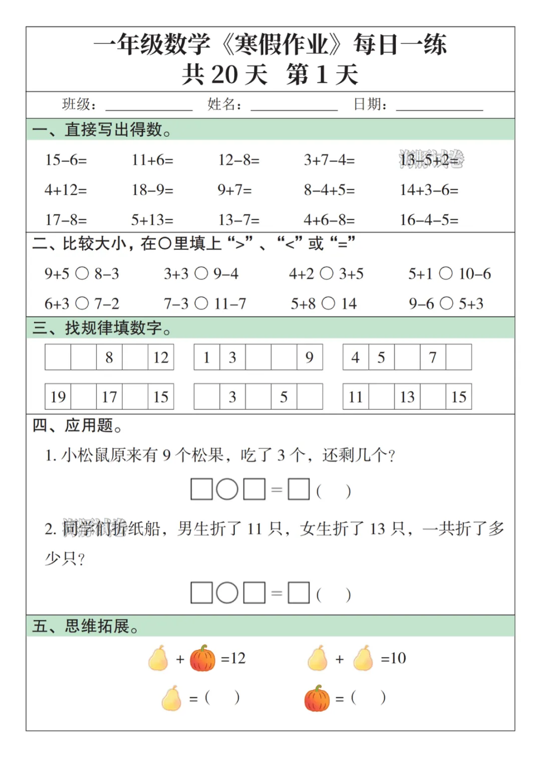 一年级数学寒假作业每日一练