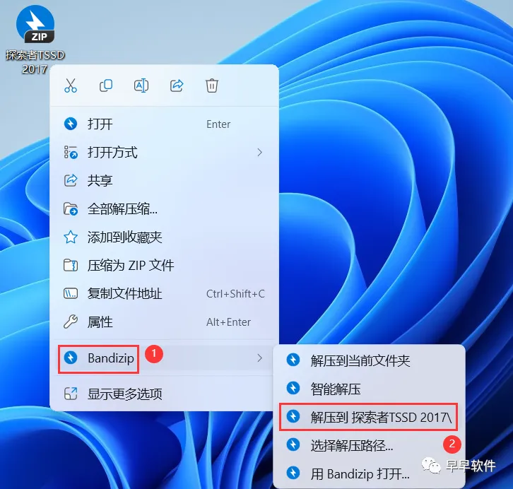 1、下载探索者TSSD 2017软件安装包到电脑上,右键选择【解压到探索者TSSD 2017\】
