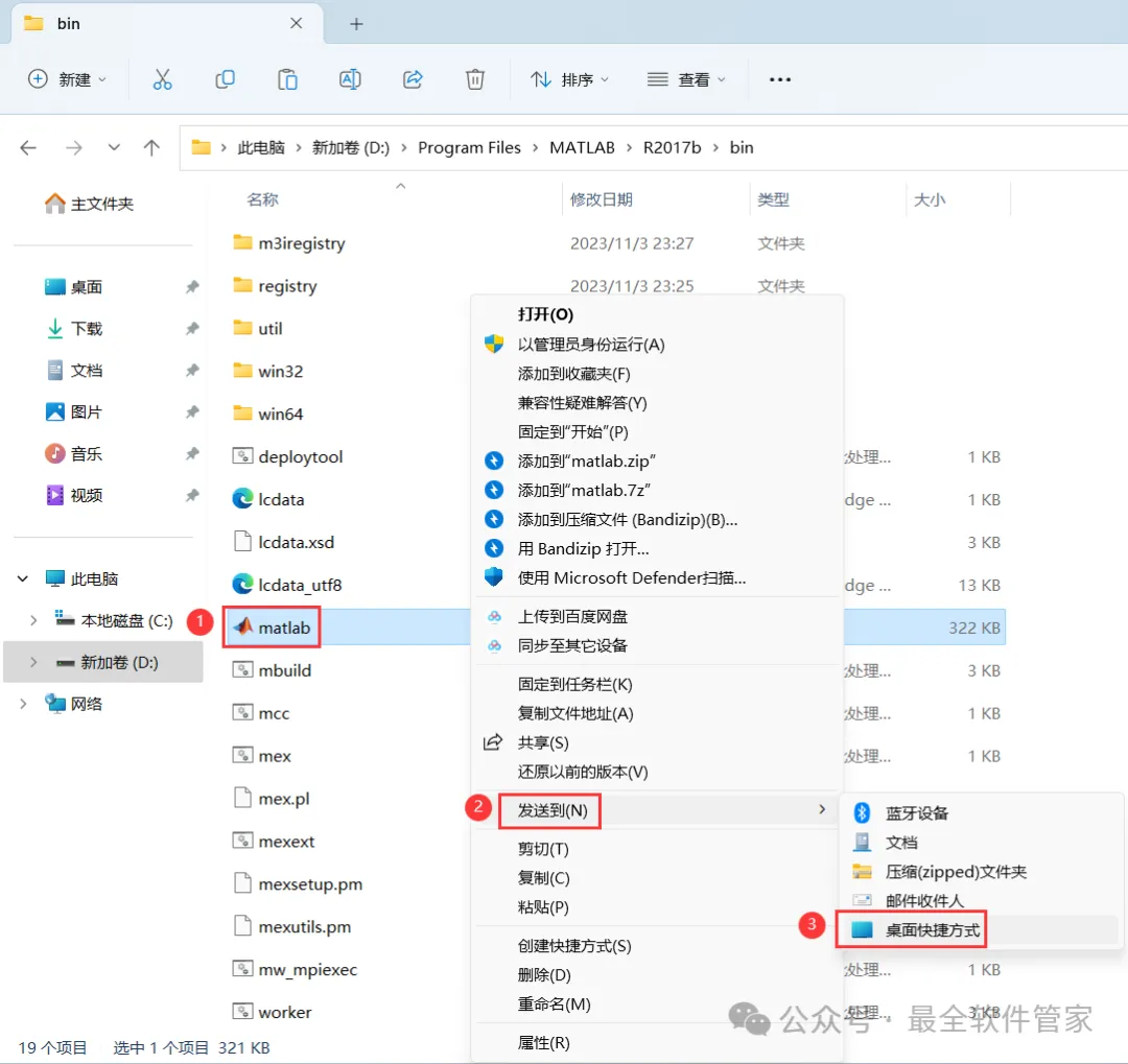 18、找到【matlab】程序,右键依次点击【显示更多选项】、【发送到】、【桌面快捷方式】,完成软件桌面快捷方式的创建