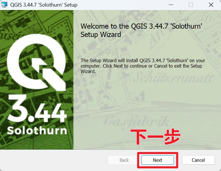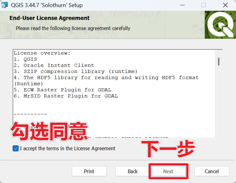 通过官网/百度网盘完成安装包下载后,按下述流程完成QGIS安装。