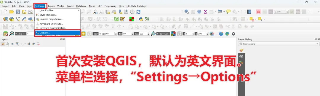 首次安装QGIS软件,默认英文界面,需进行设置切换为中文界面。