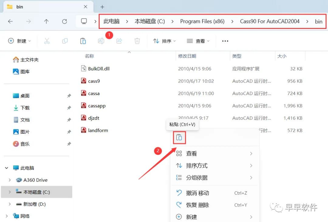 14、打开路径:C:\Program Files (x86)\Cass9.0 For AutoCAD2004\bin,再右键文件夹的空白处,点击【粘贴按钮】