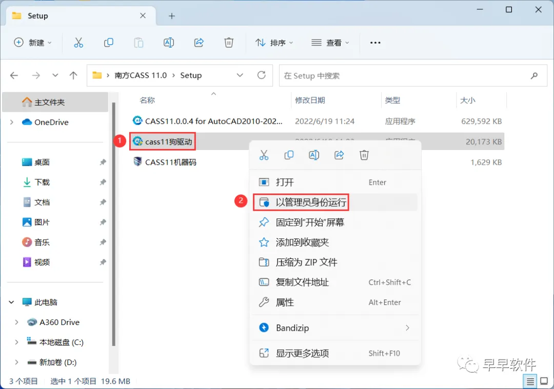 9、回到南方CASS 11.0文件夹下的Setup文件夹,找到【cass11狗驱动】应用程序,右键选择【以管理员身份运行】它