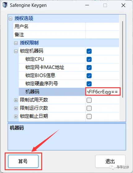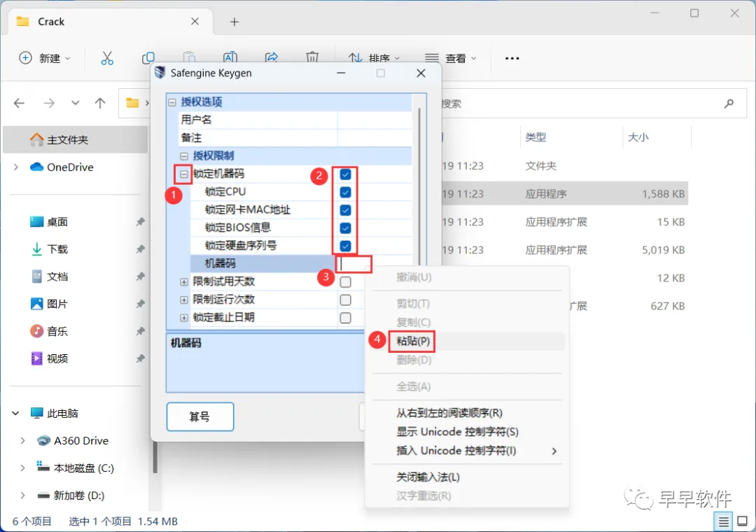 17、点击【锁定机器码的展开按钮】,勾选前5项,右键机器码输入框,再点击【粘贴】