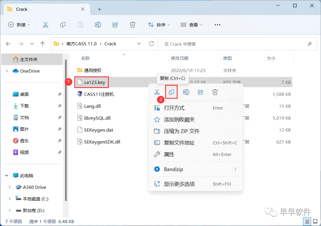 19、回到南方CASS 11.0文件夹下的Crack文件夹,找到【ca123.key】文件,右键点击【复制按钮】