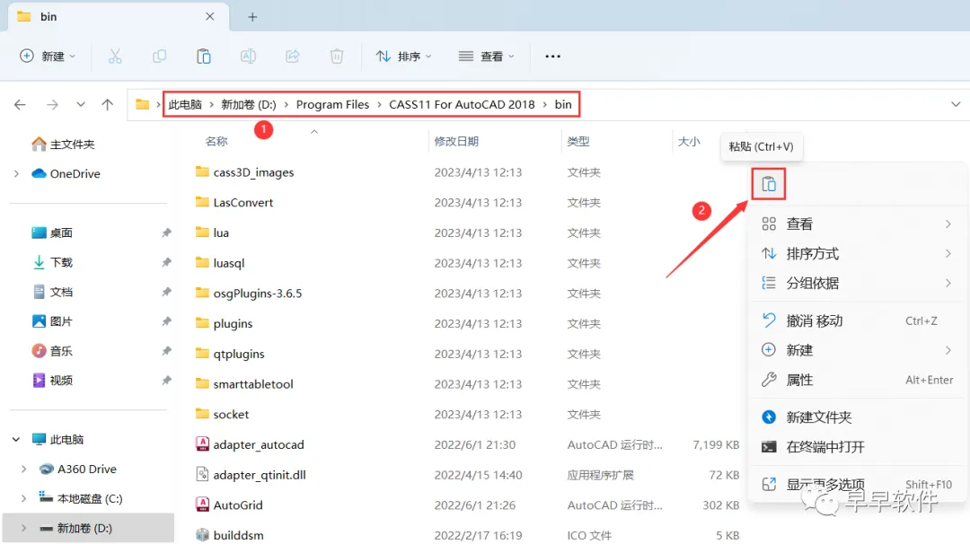 20、打开路径:C:\Program Files\CASS11 For AutoCAD 2018\bin;右键文件夹的空白处,点击【粘贴按钮】