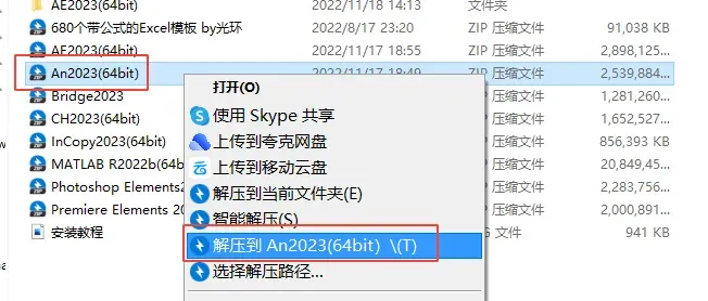 1.鼠标右击【Animate2023(64bit)】压缩包选择【解压到 Animate2023(64bit)】