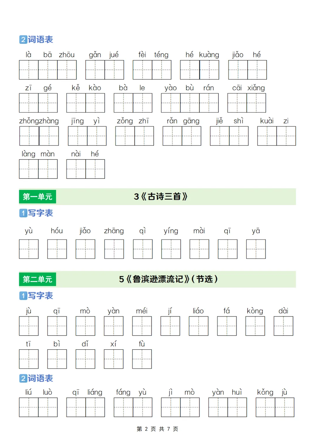 【免费下载】六年级(下)语文 【识字表+写字表+词语表】专项练,PDF电子版,共7页,可打印