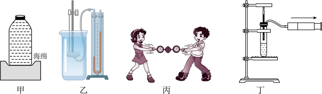 D. 丁图,向外拉活塞,试管内停止沸腾的水再次沸腾,可知气压减小,水的沸点升高