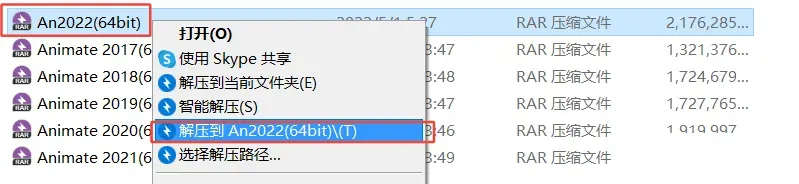 1.鼠标右击【Animate2022(64bit)】压缩包选择【解压到 Animate2022(64bit)】