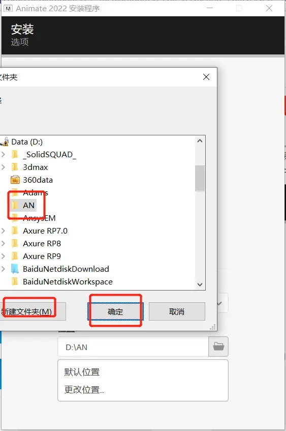 6.①点击需要安装的磁盘(我这里选择D盘,不建议安装在C盘);②点击【新建文件夹】;③选择并将新建的文件夹重命名为【AN】(注意不能命名为中文字符);④点击【确定】