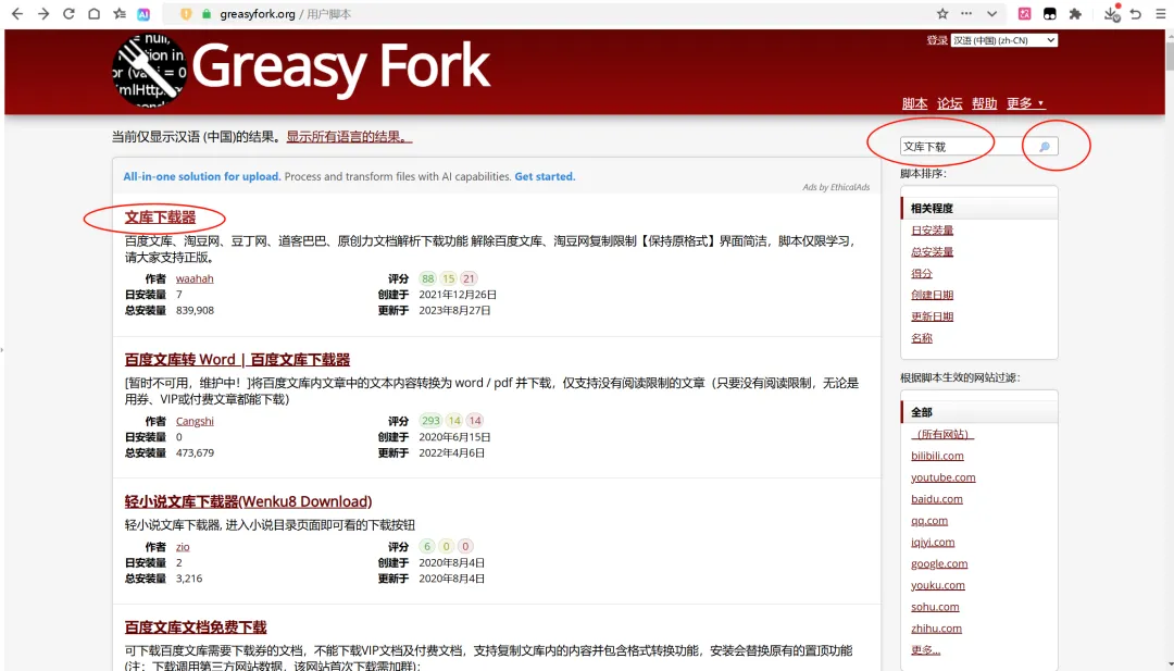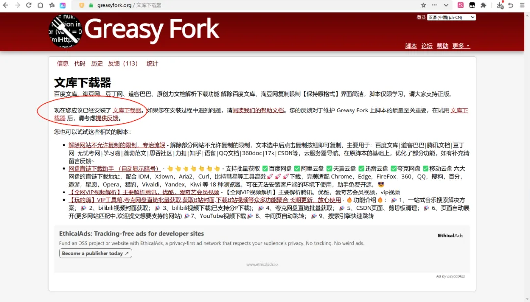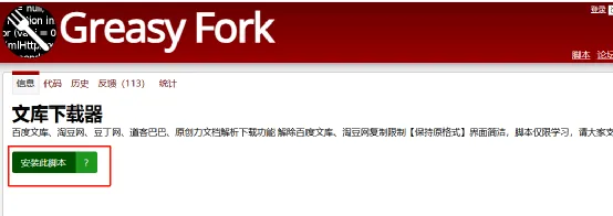 第二步:给“篡改猴 (Tampermonkey)”插件安装“文库下载器”脚本