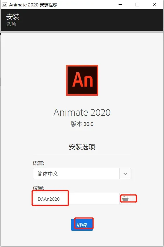 3.点击【文件夹图标】→点击【更改位置】可更改安装位置(建议不要安装在C盘,可以在D盘或其它磁盘下新建一个“An2020”文件夹。注:安装路径中不能有中文),点击【继续】