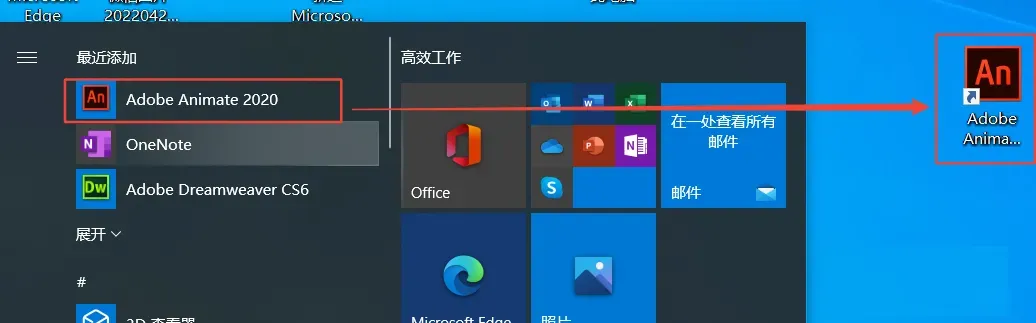 6.创建桌面启动快捷方式:点击桌面左下角【开始】图标,点击【所有应用】→找到并拖动【Adobe Animate CC 2020】图标到电脑桌面