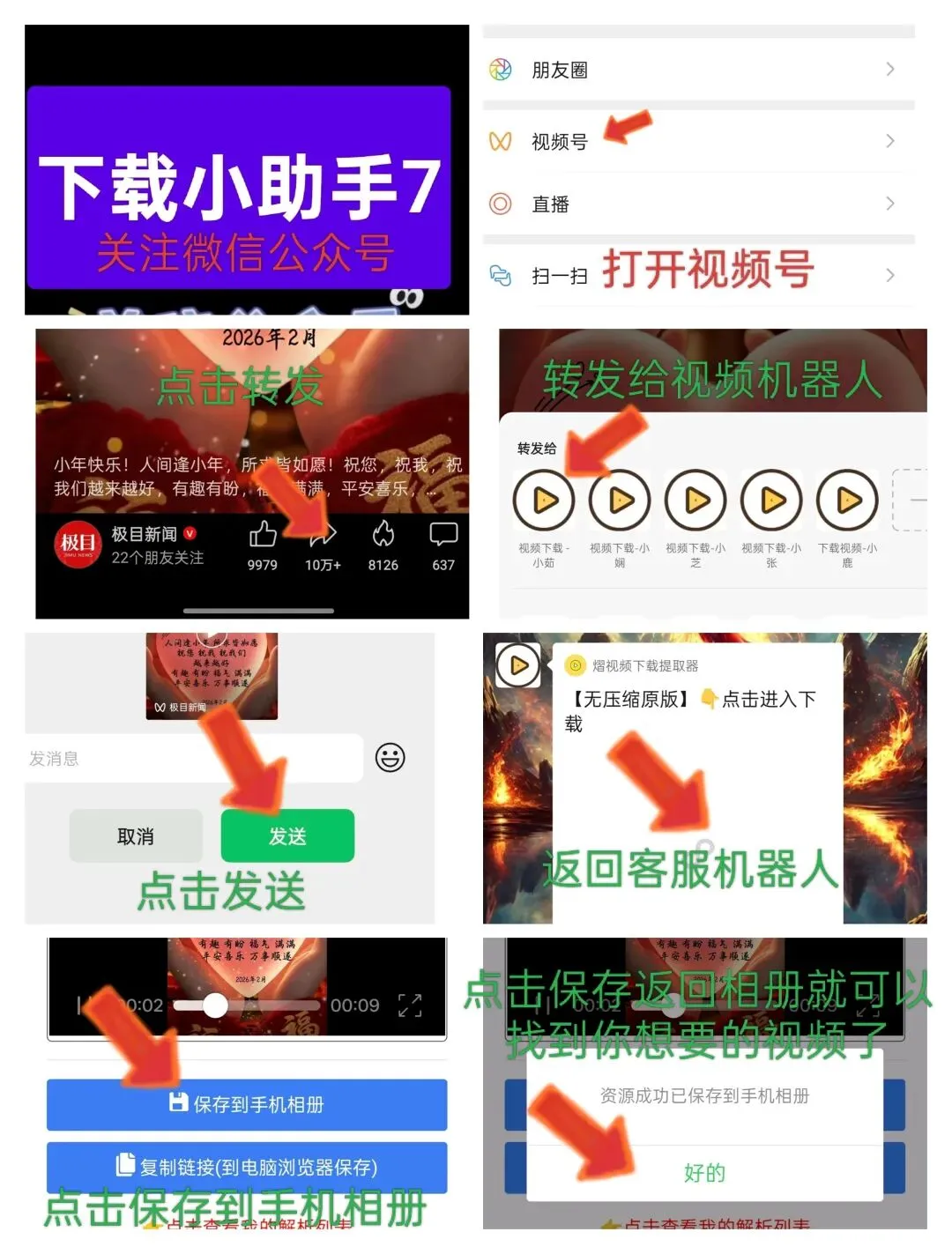 你是不是也在微信视频号刷到过超赞的视频,想保存却不知道怎么下载?或者搜过“视频号视频下载”“视频号视频提取”却总踩坑?别急,今天给你安利个超实用的视频下载助手——来自公众号“下载小助手7”的“视频下载机器人”,支持视频号视频下载、视频号视频提取,还能一键下公众号、B站、抖音、快手、小红书等平台无水印视频,搜一搜这些关键词就能找到我们!