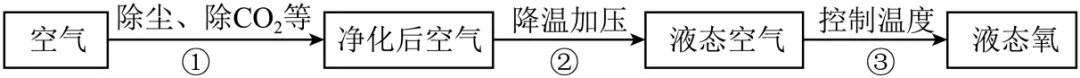 【详解】A、过程②中降温加压过程中,只是微粒之间的间隔发生了改变,氧分子的大小不变,选项正确;