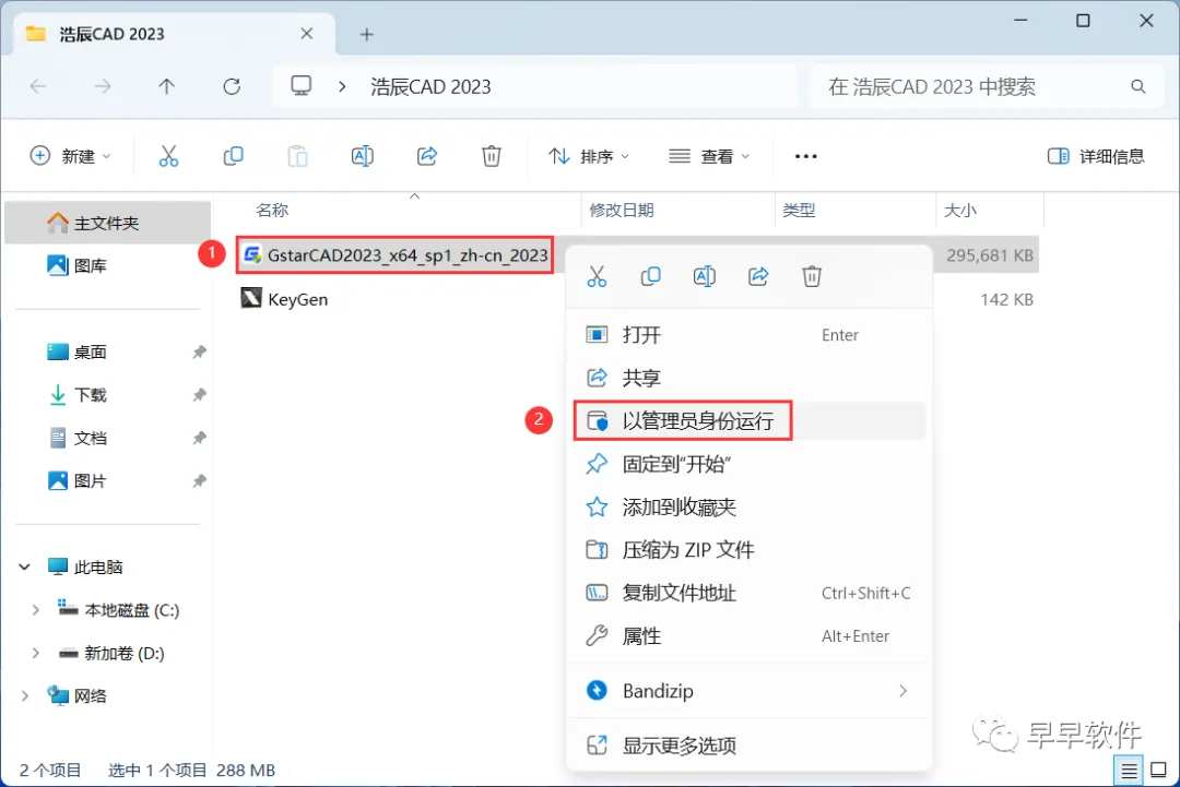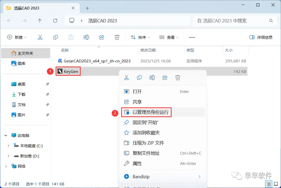 9、回到浩辰CAD 2023文件夹,找到【KeyGen】应用程序,右键选择【以管理员身份运行】它