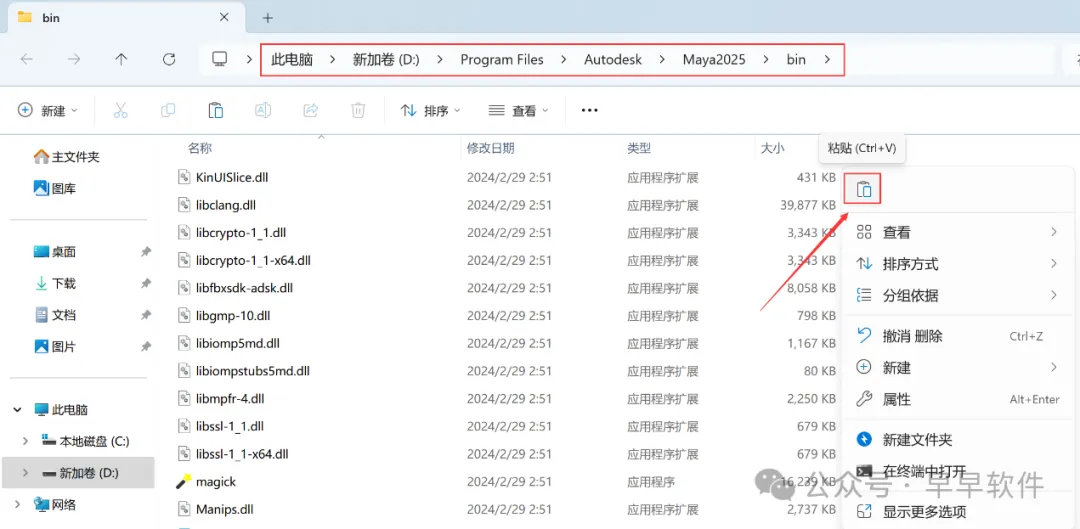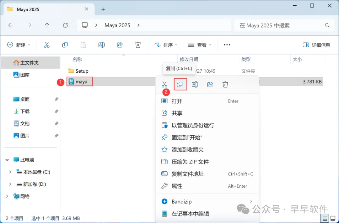 10、回到Maya 2025文件夹,找到【maya】文件,再右键点击【复制按钮】