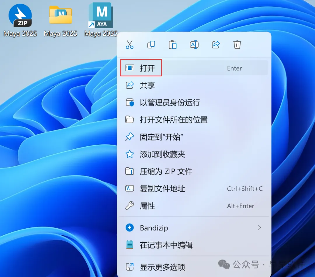14、回到桌面,右键桌面上的【Maya 2025软件图标】,点击【打开】