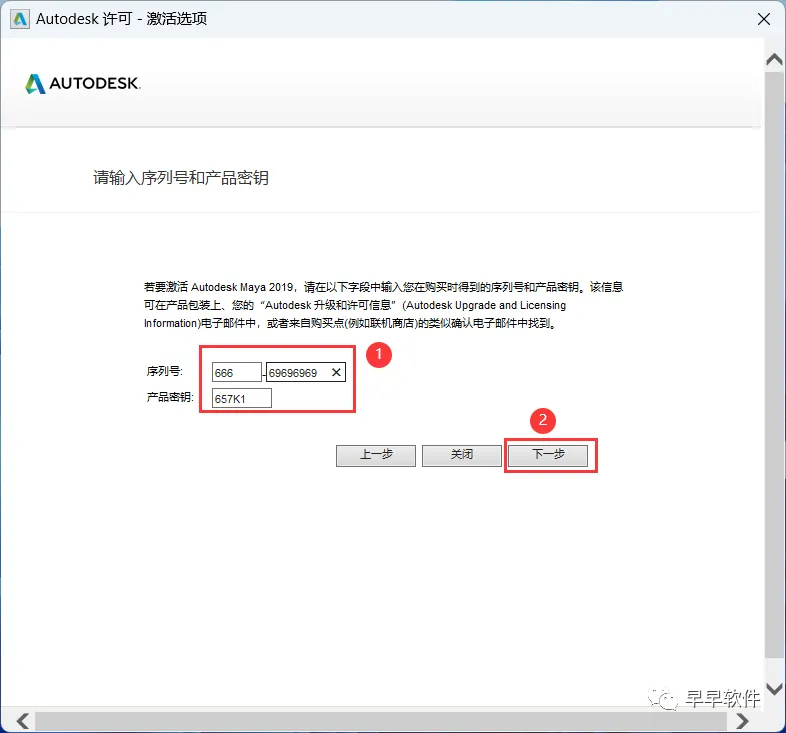 16、序列号输入:666-69696969,产品密钥输入:657K1,再点击【下一步】
