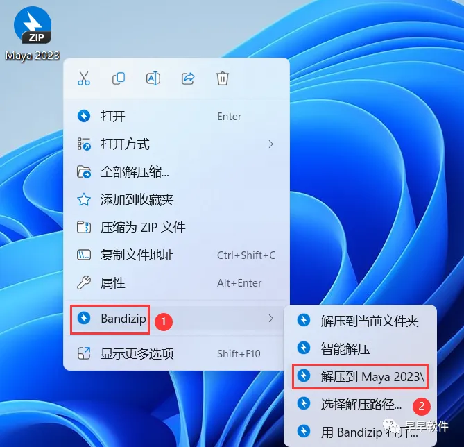 1、下载Maya 2023软件安装包到电脑上,右键选择【解压到Maya 2023\】