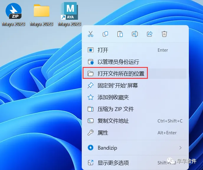12、回到桌面,右键桌面上的【Maya 2023软件图标】,点击【打开文件所在的位置】