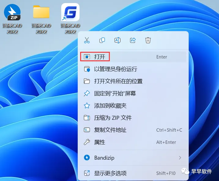 14、回到桌面,右键桌面上的【浩辰CAD 2022软件图标】,点击【打开】;注意:软件打开显示试用30天,实际可以无限制循环使用