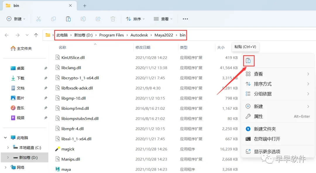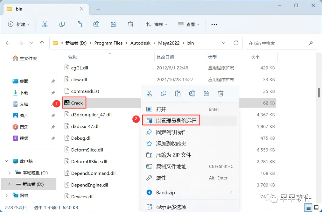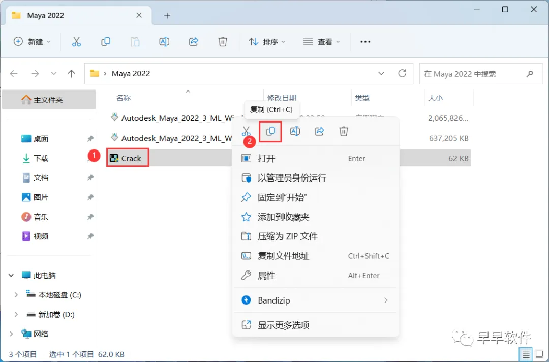 10、回到Maya 2022文件夹,找到【Crack】文件,再右键点击【复制按钮】