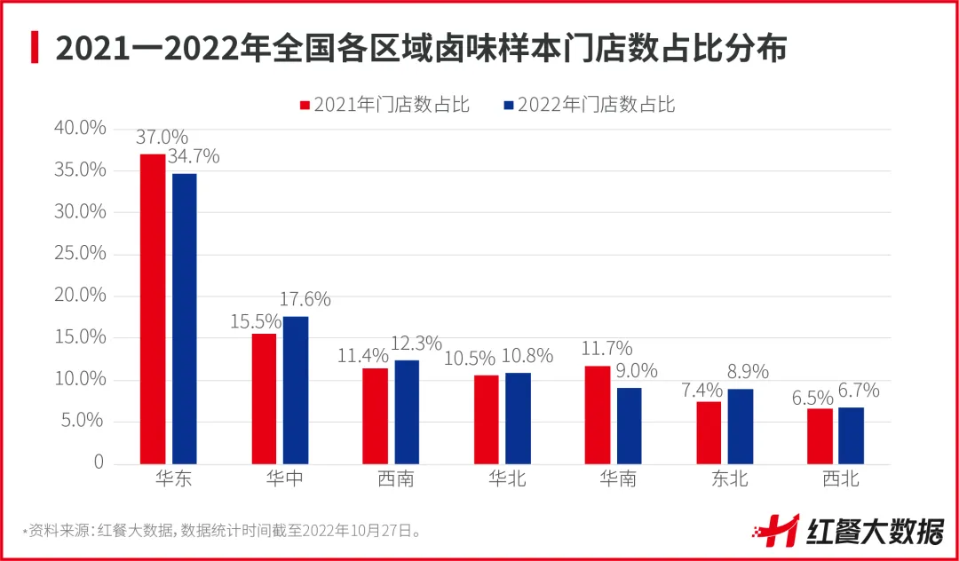 在区域分布方面,截至2022年10月27日,华东区域有着最多的卤味门店数,约占总门店数的34.7%,这主要由于华东地区的卤味品类起步较早,孕育出了紫燕百味鸡、久久丫、留夫鸭等实力品牌,增强了资源整合效应。