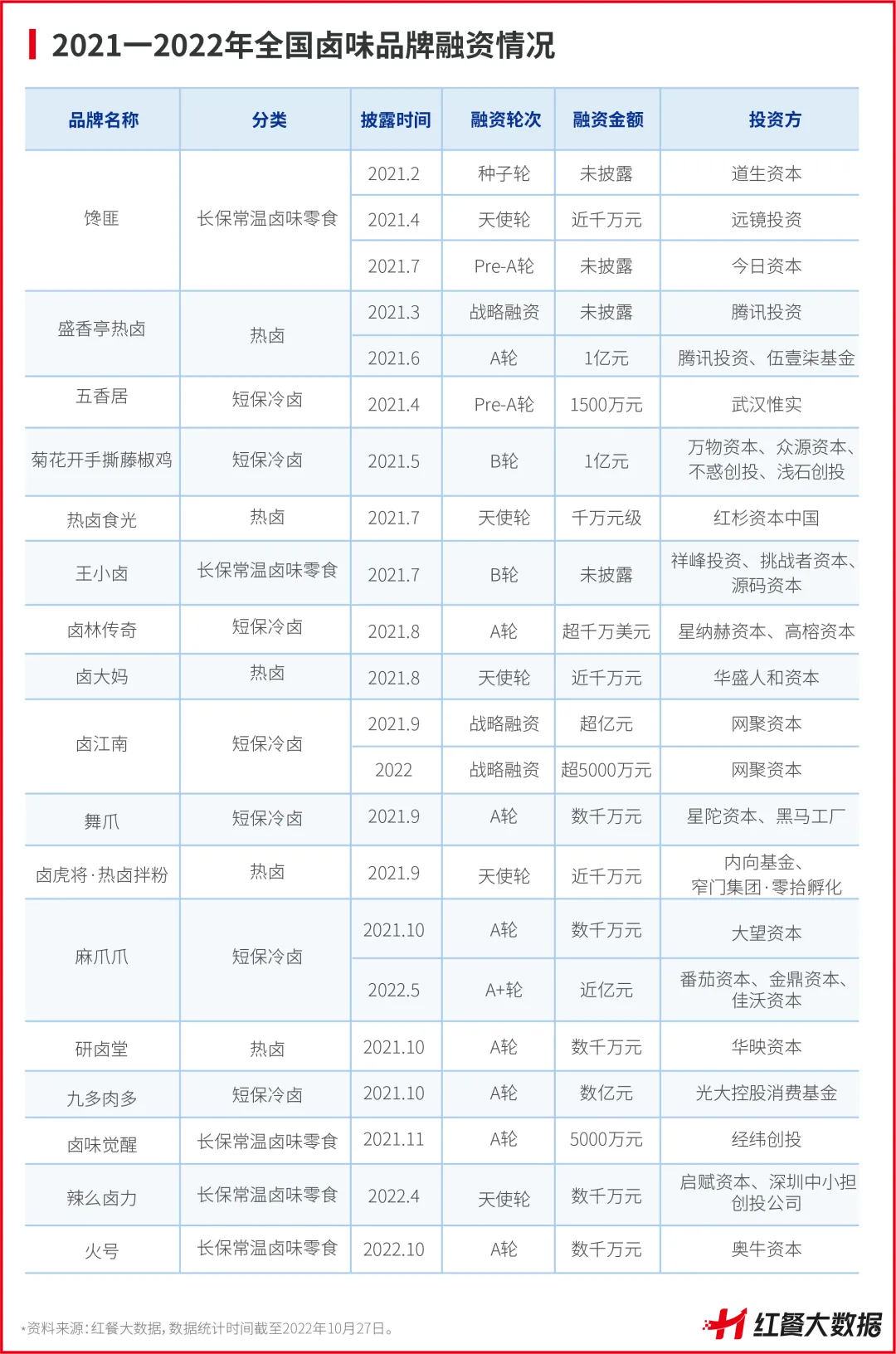 新式热卤热度下滑也可从资本方的态度看出。红餐大数据显示,2021年热卤赛道的融资事件共计6起,占卤味全品类融资事件数的三成,而进入2022年,截至10月27日,热卤赛道尚未有相关融资事件披露。可见资本对于热卤品牌的投资趋于冷静,态度变得谨慎。