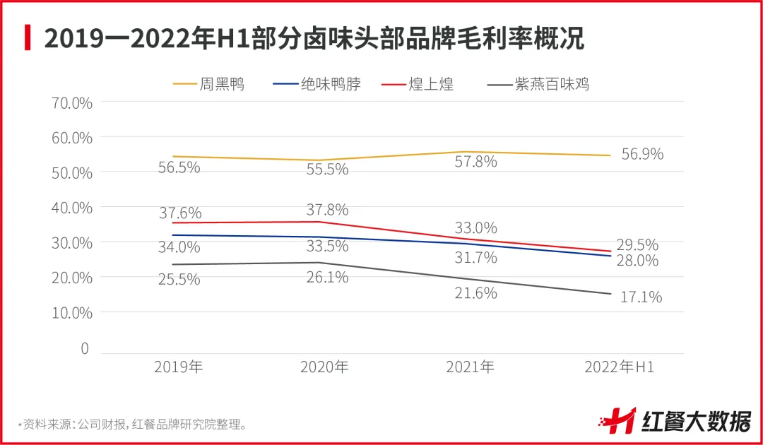 与此同时,头部品牌触及增长天花板。比如,煌上煌的毛利率持续下跌,2019至2022年H1的毛利率分别为37.6%、37.8%、33.0%、29.5%。周黑鸭的毛利率亦不断波动,2019至2022年H1的毛利率分别为56.5%、55.5%、57.8%、56.9%。