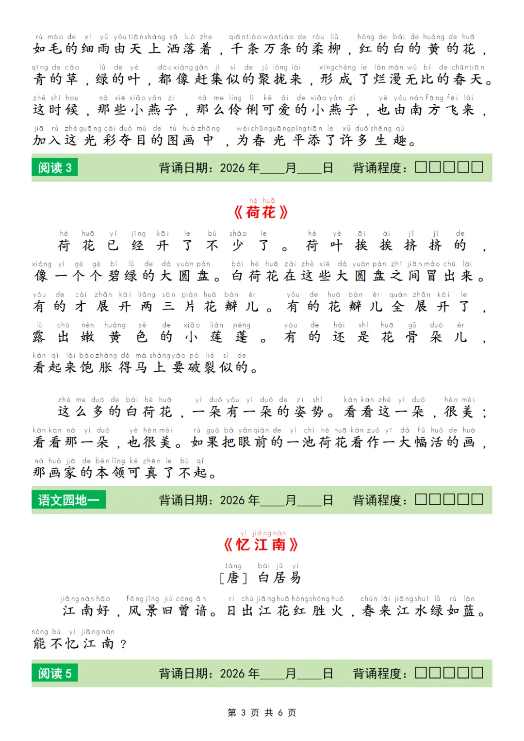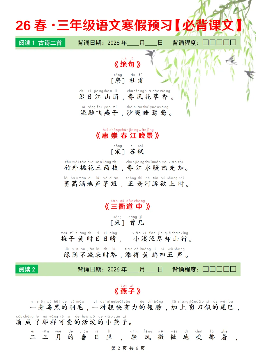 【免费下载】三年级(下)语文 26春寒假预习必背课文,PDF电子版,共5页,可打印