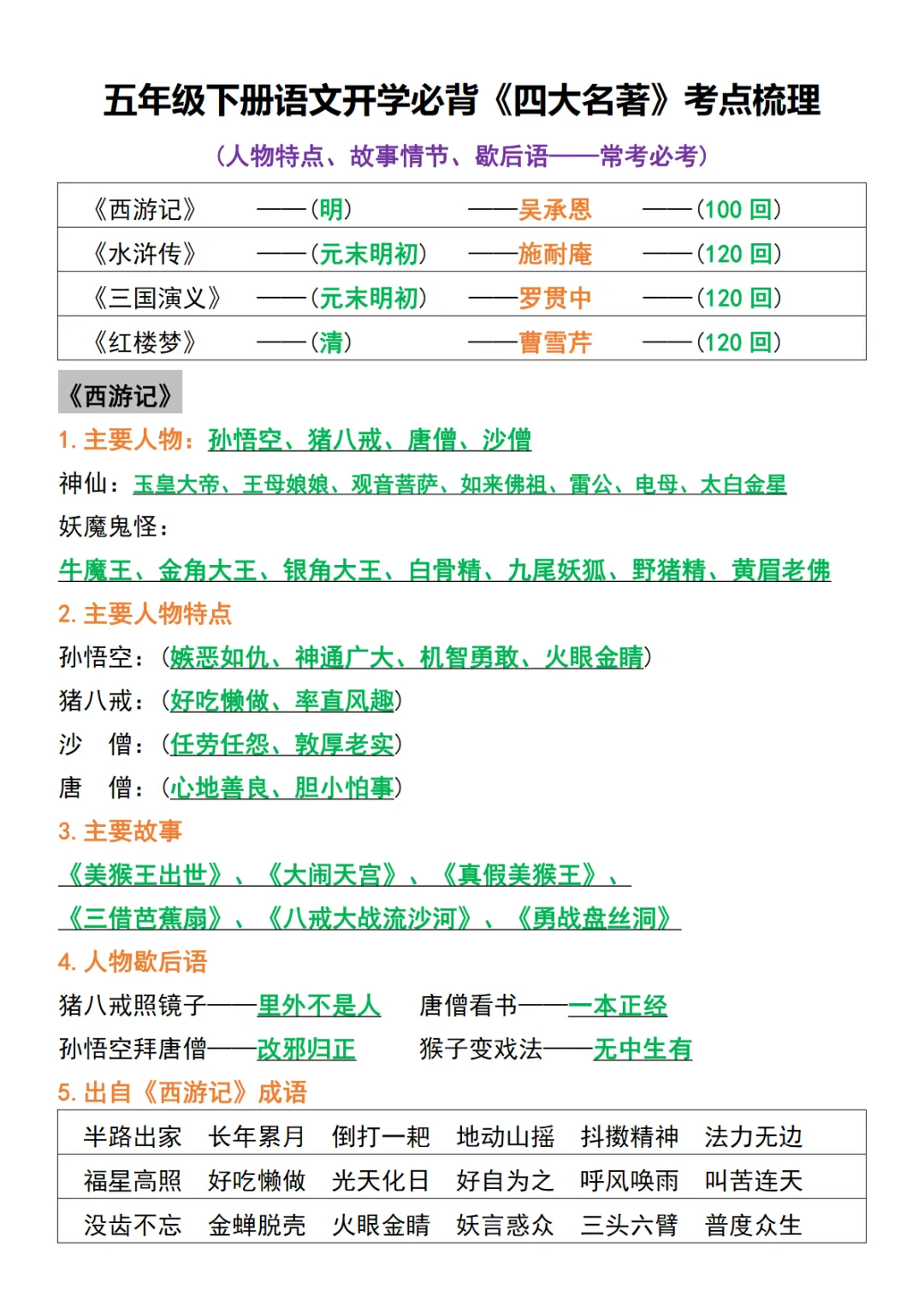 【免费下载】五年级(下)语文 开学必背《四大名著》考点梳理